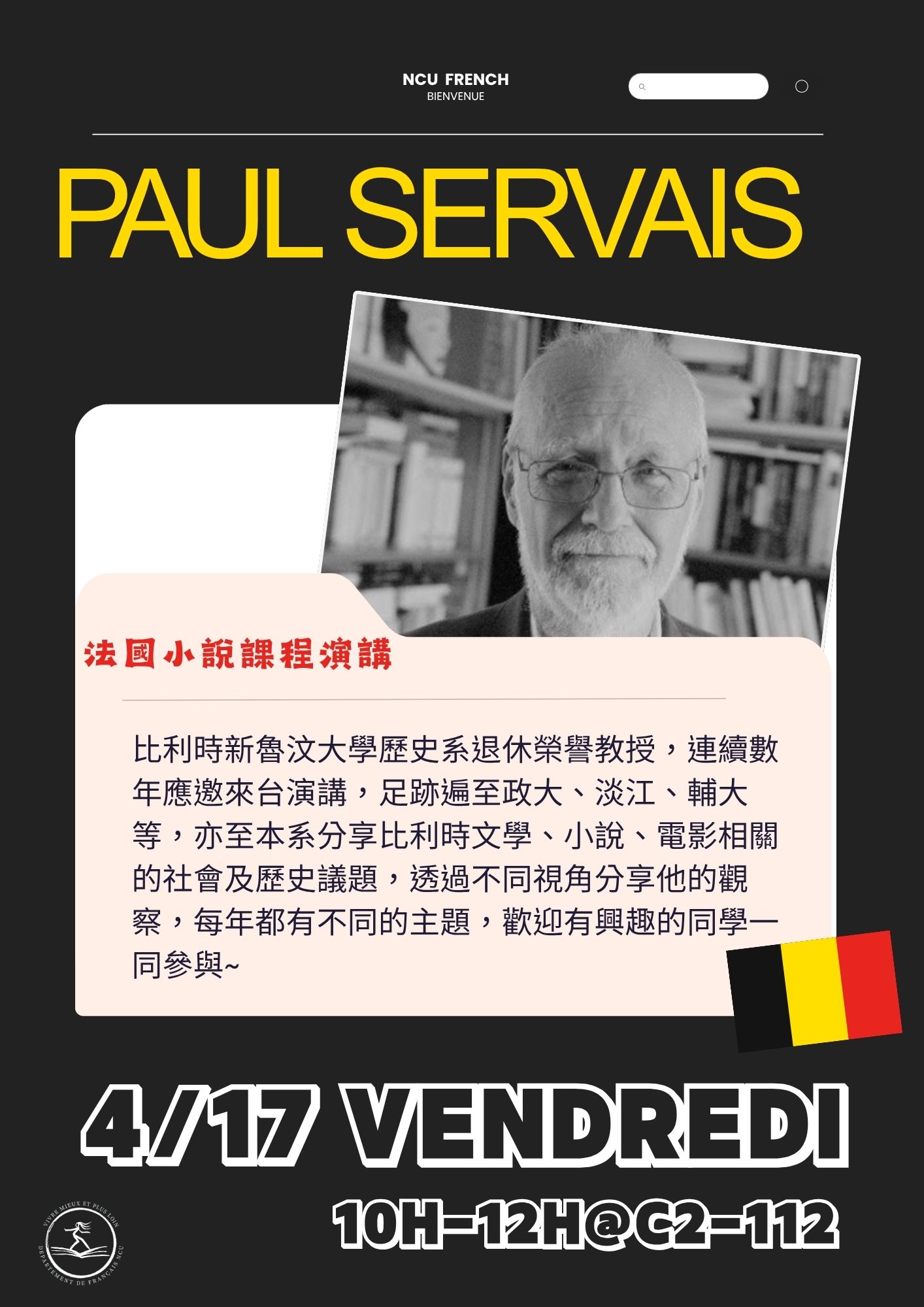 4/17 Paul Servais 法國小說課程演講 FrenchManager 2026-04-10 四月到了,尋寶獵人請注意,期間限定的神秘老師即將再度出現於本系,機會難得!來自比利時的Paul Servais老師(新魯汶大學歷史系榮譽退休教授)下週五即將出沒於小翁老師的法國小說課堂,請把握時間,蒐集精彩可期的比利時文學彩蛋! 時間:115年4月17日(五)10:00-12:00 地點:C2-112教室 Tags: news Continue Reading Previous: 4/9 口表課復活節闖關遊戲